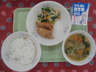 今日のメニューは、ごはん、牛乳、肉巻き、お浸し、田舎汁です。