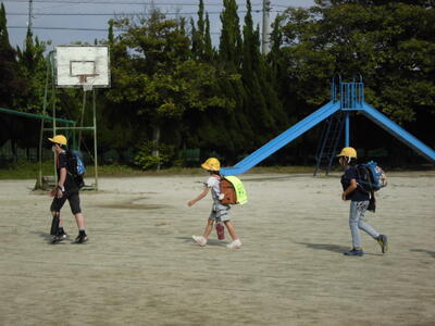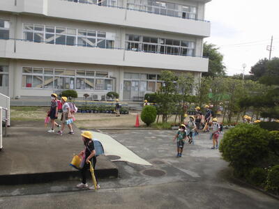 ( ↓ 一斉下校が始まりました。途中途中で、交通安全ボランティアの皆様に下校を見守っていただきます。)