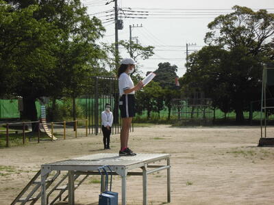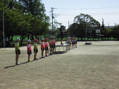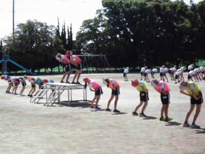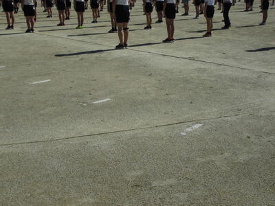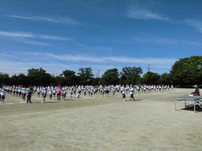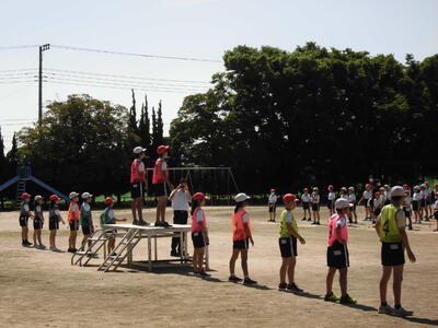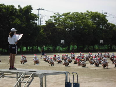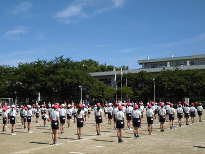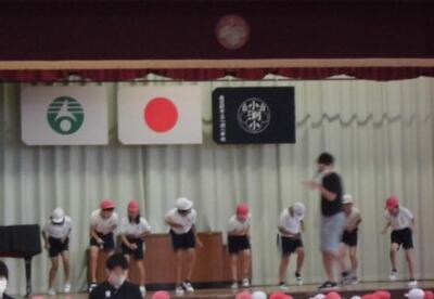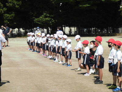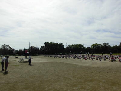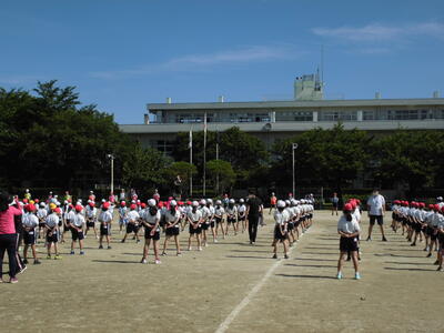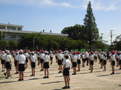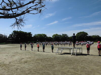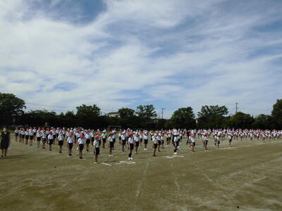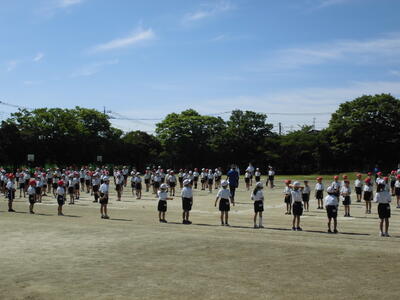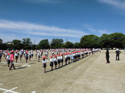 小渕小学校は「はだしの学校」の言葉どおり、子供たちがはだしで校庭で運動する伝統がありますが、今年はウイルス感染拡大防止のため(洗い場が密になったり、足ふきタオルの共用を避けたりするため)、本日は全員が運動靴をはいておこないました。また、子供同士の間隔をあけるため、最初から体操隊形で広がって集合しました。