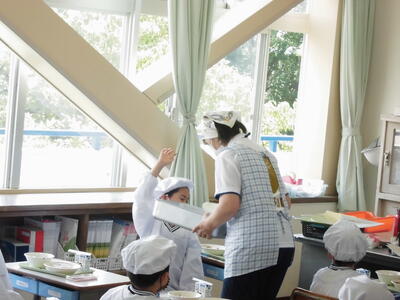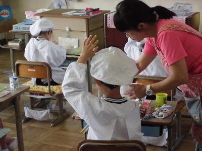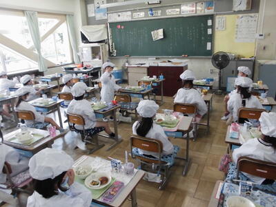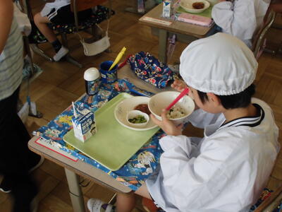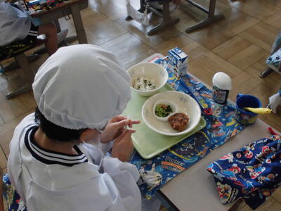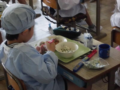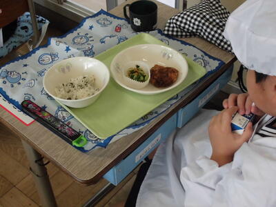 給食の時間になりました。一年生が、おいしそうにいただいています。