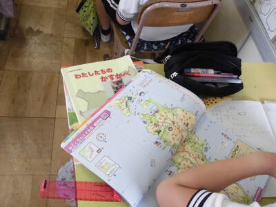 ( ↓ 地図帳を開いて、地名や場所を確認しています。)