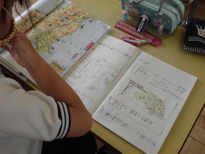 ( ↓ ノートに小さな地図を貼りつけて、まとめています。)