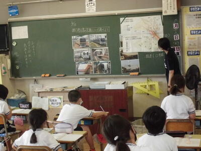 ( ↓ 鉄道の写真などを見ながら、埼玉県の交通について考えています。)