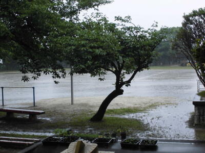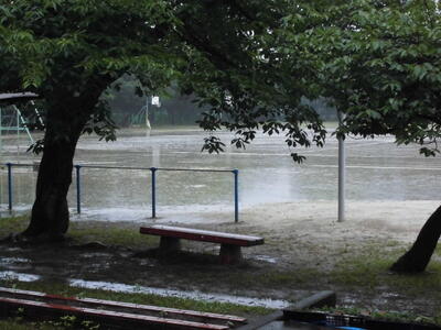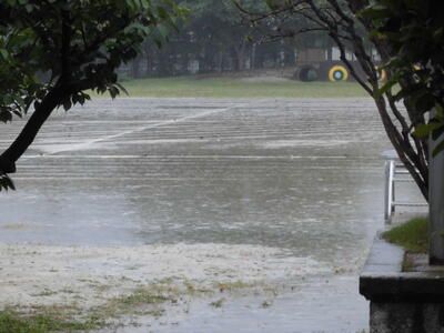 ( ↓ 午後の雨。校庭にも大きな水たまりができました。)