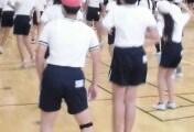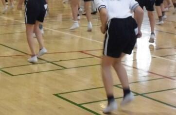 ( ↓ 今年初めての朝の「さわやかタイム(みなで運動する時間)」も校庭でできないので、体育館でおこないました。密を避けて、間隔をとりながら、その場でジャンプしたり、足踏みしたりしました。足踏みでは、ステージ上の先生と数を競いました。)