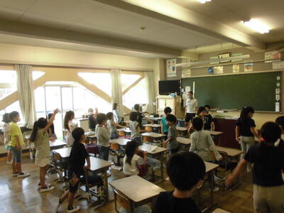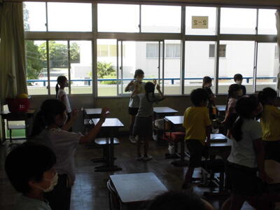 ( ↓ 2年生の朝の会。朝の歌が流れ、歌に合わせてダンスをしたりしています。)