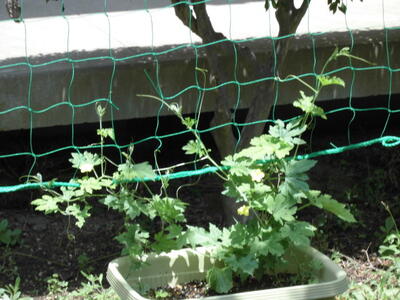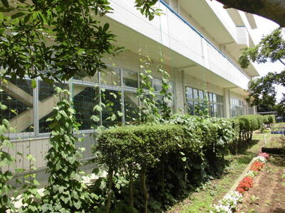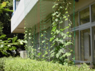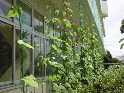今年も校舎一階から二階のべランダへ向かってネットを張りました。このあと、アサガオやヘチマ、ゴーヤなどが成長して、グリーンカーテンができる予定です。植物は、自分の周りの温度を下げてくれるので、グリーンカーテンの木陰は、ただの日陰より涼しいのだそうです。