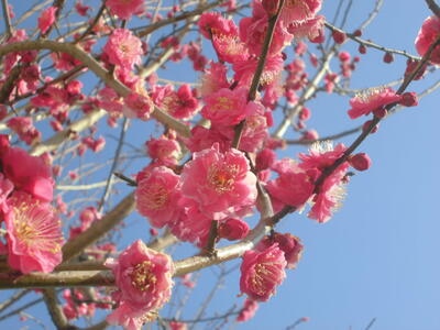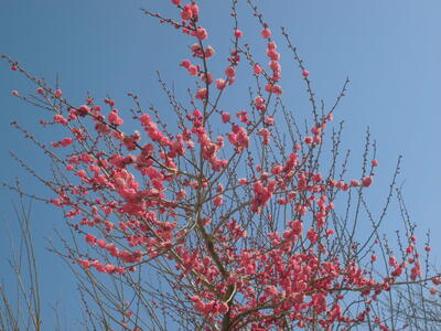 学校では、梅の花がきれいに咲いて、晴れた日は、赤い花が青い空に映えています。よい香りもただよっています。(下は先日の金曜日の写真です)