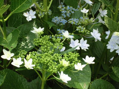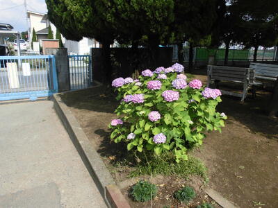 ( ↓ 校庭沿いのアジサイ。これから咲いていきます。)