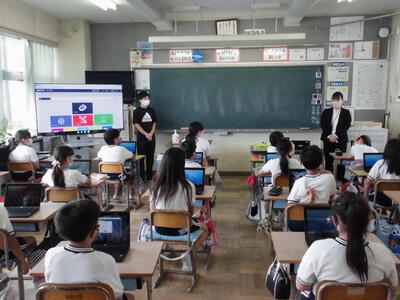 学校では、GIGAスクール構想に伴い一人一台配備されたタブレットを活用して学習をおこなっています。今日は5年生が、タブレットの新しいソフトの機能を使って、自分の意見を入力し、他の児童や先生と共有・交換して効果的な学習を進めました。ICTサポーターさんにも協力してもらいながら学習を進めました。