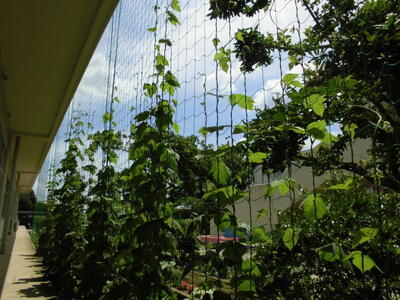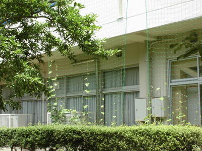 今年も校舎一階から二階のべランダへ向かってネットを張りました。このあと、アサガオやヘチマ、ゴーヤなどが成長して、グリーンカーテンができる予定です。植物は、自分の周りの温度を下げてくれるので、グリーンカーテンの木陰は、ただの日陰より涼しいのだそうです。