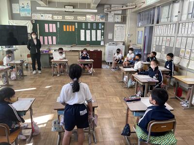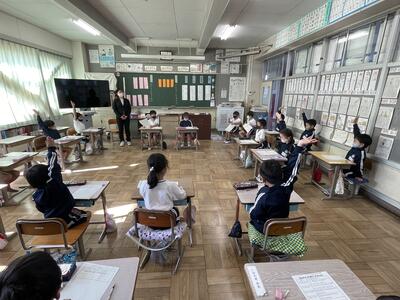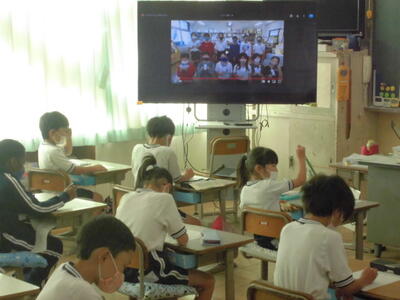 「集会」の予定でしたが、感染症対策のため、一斉に集まるのは中止として、各教室の大型モニターに図書委員さんが用意した映像を映しました。その後、教室では学年ごとに、読書や教科書に関するクイズ用紙が配られ、子供たちは熱心に取り組んでいました。