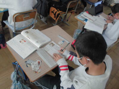 六年生が5時間目の自習に取り組んでいます。国語の学習で、「日本の文化を発信しよう」のテーマでパンフレット作りをおこなっています。寿司や和食、刀、生け花、着物、アニメ・・・・・・など各自がテーマを決めて静かに集中して作業しています。