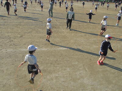 (2分が経過すると、中学年の3・4年生が飛び始めます。3・4年生は、5分間にチャレンジです。)
