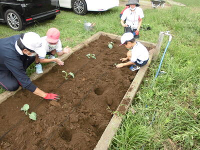 今日は学校の農園に、たんぽぽ・ひまわり学級の子供他たちが、ブロッコリーの苗を植えました。校長先生に教わりながら、ていねいに苗を置いたり、土をかぶせたりしていきました。最後に、自分たちが苗を植えた畑を眺めて、ブロッコリーが元気に育ってくれることを願って、教室に戻りました。