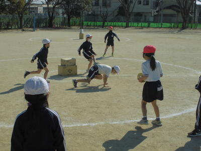 ( ↓ 1年生の体育の授業。サッカーに取り組んでいます。守備側の守るゴールのダンボ-ル箱をめがけて攻撃側がかかんにシュートしています。)