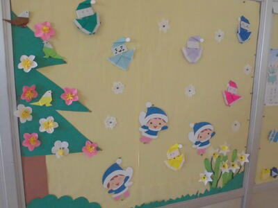 たんぽぽ・ひまわり学級の廊下の掲示も2月らしいものに変わっています。