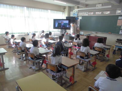 ( ↓ 朝のお話朝会。一斉には集まらないで、放送室と各教室をリモートでつないで。校長先生のお話や、生活について保健室の先生のお話を聞きました。)