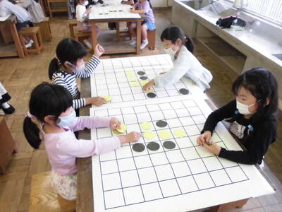 ( ↓ 1~4年生は、オセロ遊びをおこないました。大き目のオセロ版とコマで対戦を楽しみました。)