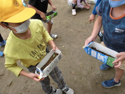 教室(ベランダ)の牛乳パックのミニ花壇で育ててきた花の芽を花壇に植え替えました。