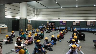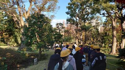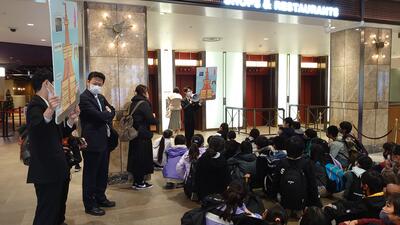 クラス写真撮影、説明の後、階段で展望デッキへ出発します!