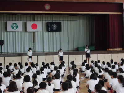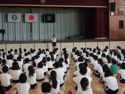 本日の朝は、体育朝会。プール開き集会をおこないました。