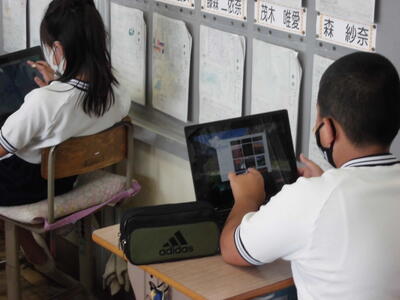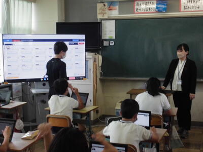 学校では、GIGAスクール構想に伴い一人一台配備されたタブレットを活用して学習をおこなっています。今日は5年生が、タブレットの新しいソフトの機能を使って、自分の意見を入力し、他の児童や先生と共有・交換して効果的な学習を進めました。ICTサポーターさんにも協力してもらいながら学習を進めました。