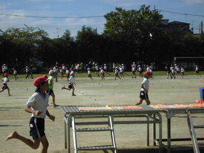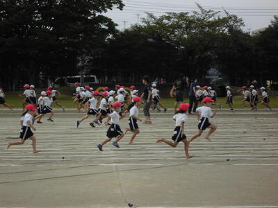 本日の朝は全校運動の時間「さわやかタイム」です。自分自身の体力向上や運動会を目標に、子供たちは元気に校庭を走っています。