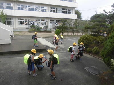 本日も、一日、天候が不安定でした。急に暗くなって、突然強い雨が降ってきたり、やんで晴れ間が見えたりと、変化が激しい一日でした。下校時間帯の強風や雷雨を心配しましたが、さいわい下校時間には晴れ間が出て、雨も降っていなかったので、子供たちは安全に下校しました。(写真は下校時の様子)