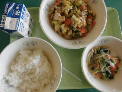 4日の給食は、ごはん、牛乳、生揚げと豚肉のみそ炒め、春雨サラダ、でした。