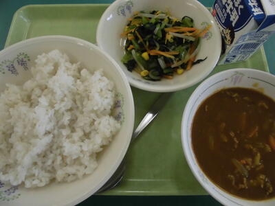 9月6日の給食。カレーライス(麦ごはん・ルウ)、牛乳、彩りサラダ、でした。