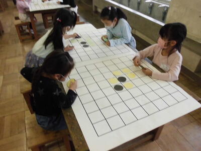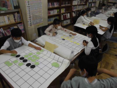 ( ↓ 1~4年生は、オセロ遊びをおこないました。大き目のオセロ版とコマで対戦を楽しみました。)