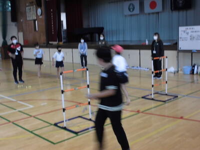 ( ↓ 5・6年生は、体育館で新スポーツをおこないました。「ラダー・ゲッター」という、手元のボールが付いた日ロープを投げて、はしごに順に引っ掛ける競技です。)