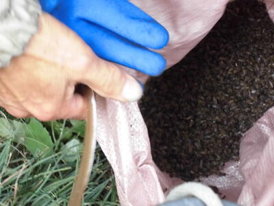 ( ↑ ハチを麻酔で眠らせて巣を撤去しました。ハチは処分するのではなく、飼育する人に譲りわたすそうです。人にとっても、ハチにとっても安全な場所で、飼育されるそうです。)