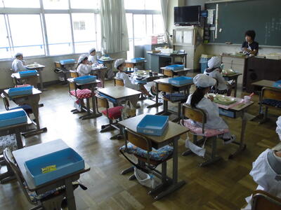 ↑ 一年生は初めての給食ですが上手に準備できました。また、教室もこの時期に大切な感染予防に気をつけて静かに食べました。