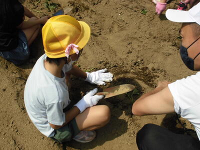 学校の近くに地域の方から土地をお借りしてサツマイモを栽培します。栽培ボランティアの方にご指導いただきながら1・2・3年の子供たちがサツマイモの苗を植えました。(今週は分散登校のため、昨日と違う児童が来ています。)