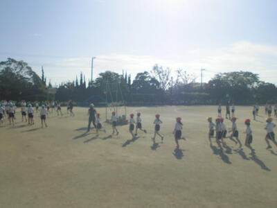 今日の朝は「さわやかタイム」。さわやかに晴れ渡った空のもと、全校で運動の時間です。