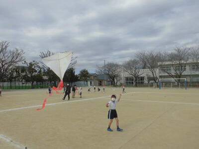 4時間目は校庭に出て、自分の作った凧をあげてみました。