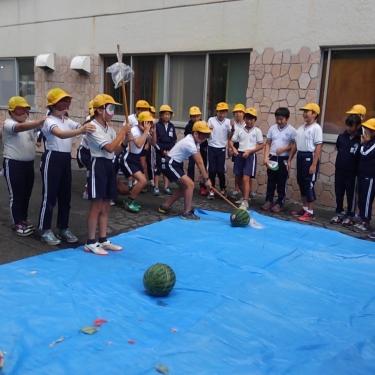 すいか割り② 投稿日時 : 2017/07/24 小渕小 カテゴリ: すいか割りは5人一組で、 一番後ろのひとだけマスクをしないで 司令塔として合図を出します。 一番前の人に上手く合図を送り、 割ってもらいます。 協力とチーム力が大事です。