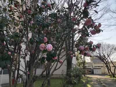 学校の敷地内に乙女椿(おとめつばき)の花が咲いています。淡いピンクの花びらが、らせん状に幾重にも重なりって咲いている様子が、とてもきれいな花です。