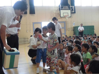 終業式の後、9月24日(土)に実施する運動会の赤組・白組抽選会を行いました。