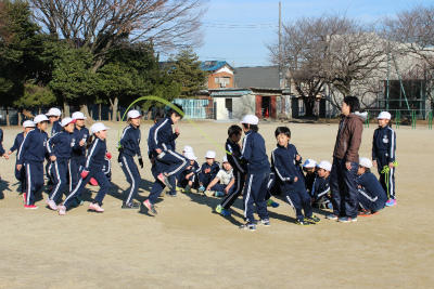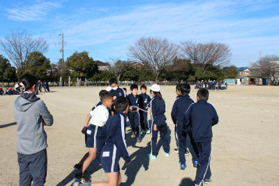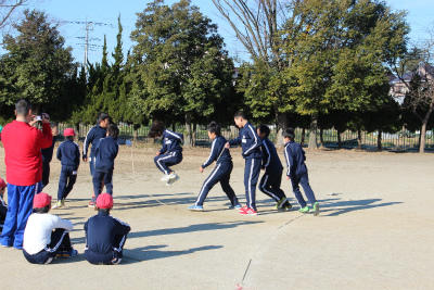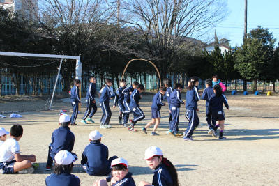 これまで練習を重ねてきた「8の字跳び」、5分間で何回跳べるかをクラス対抗で競いました。