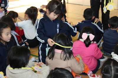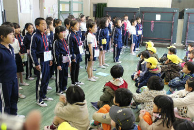 4月からの生活が楽しみになるように、1年生たちが学校の生活の様子を説明したり、校舎内を案内したり、体育館で遊んだりしました。