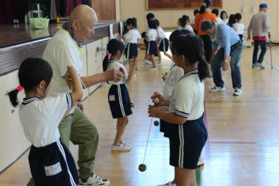 午前中、1年生と2年生の生活科で「むかしの遊びを教わろう会」を行いました。