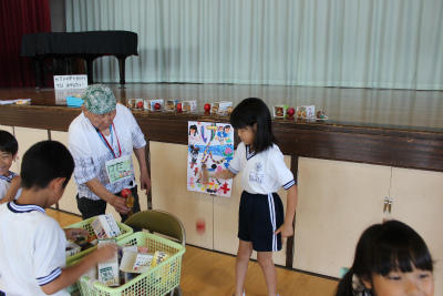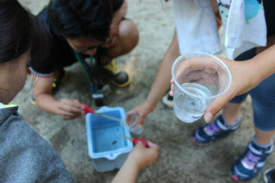説明を受けた後、スポイトでカップに幼虫を入れ…