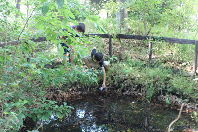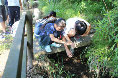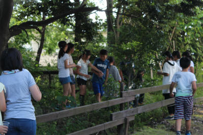6年生が、昨年秋から育ててきたホタルの幼虫を校地内「トトロの森」に放流しました。