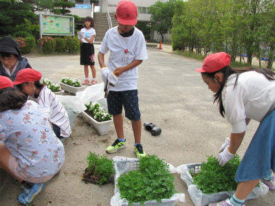 栽培委員会の子どもたちが、苗植えを行いました。 きれいにアジサイが咲き始めている小渕小ですが、これからもっと色鮮やかになりそうです。
