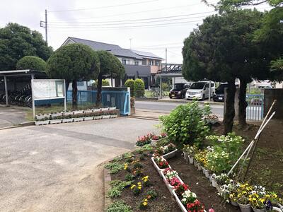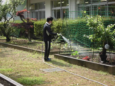 ↓ 校長先生が草花の水やりをおこなっています。他にも、教務の先生や校務員さんが除草をおこない環境の整備に努めています。