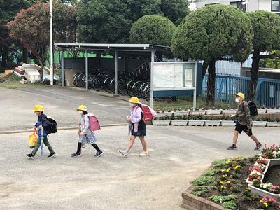 ( ↓ 分散登校の午前登校の子供たちが登校してきました。ウイルス感染防止対策で、登校班の列の間隔をあけたり、昇降口で手の消毒をしたりしています。)