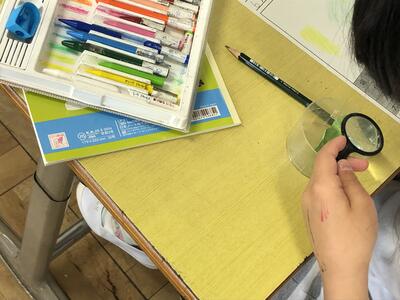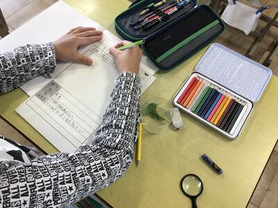 ( ↓ 学習も始まりました。本物の葉っぱやチョウの卵を机に置いて観察をしています。)